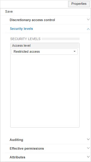 To set up security level parameters, use the Security Levels tab in the Access Control Settings dialog box in the desktop application and on the Properties side panel in the web application: