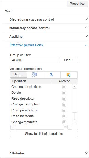If attribute-based access control is used simultaneously with discretionary access control, allowing of operation in the Allowed/Summary column depends on the selected permissions combination algorithm:
