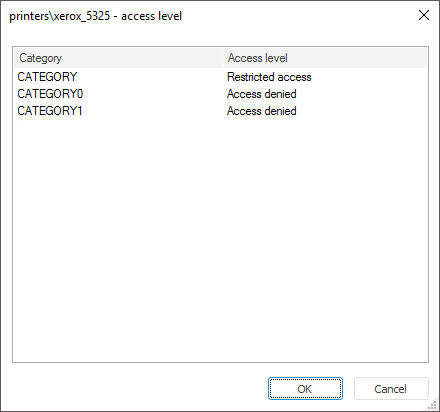 For hierarchical categories: only when the printer access mark is greater than or equal to the user access mark, except for the case when user access mark is equal to zero.