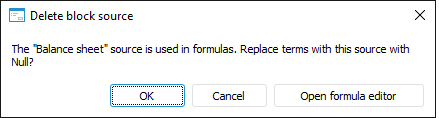 Open Formula Editor. The formula editor for changing calculation formulas with deleted data source opens. The formula editor window can be used to edit and delete formulas that use the data source. After editing or deleting formulas click the OK button and confirm the operation in the Delete Block Source dialog box.