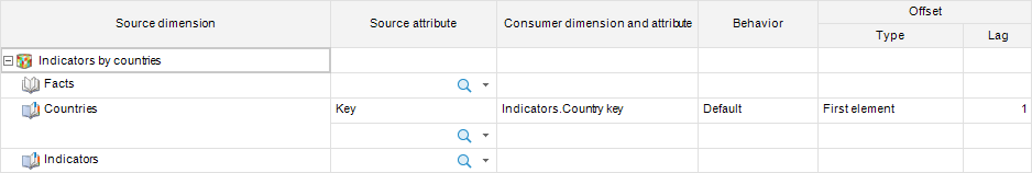 Set the number of elements, by which selection in the data source dimension is offset, in the Offset group in the Lag column. Specify offset mode in the Type column: