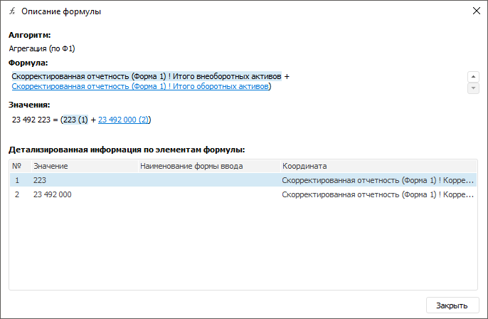 If the value is selected in the Formula area, the string with details about this element is automatically selected in the Detailed Information About Formula Elements area. If the string with details is selected in the Detailed Information About Formula Elements area, the appropriate value is automatically selected in the Formula area.