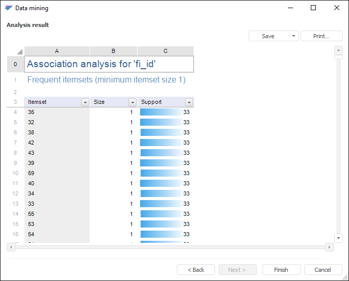 In other words, the purpose of this analysis is establishing the following dependencies: if an X set of elements is found in the transaction, it can be concluded that another Y set of elements should also be found. Establishing these dependencies enables finding simple and intuitive rules.