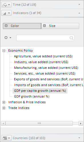 For example, when TreeMap mode is set, the panel for changing selection in indicators dimension looks like shown in the figure below, and the icons for dimensions panels change: