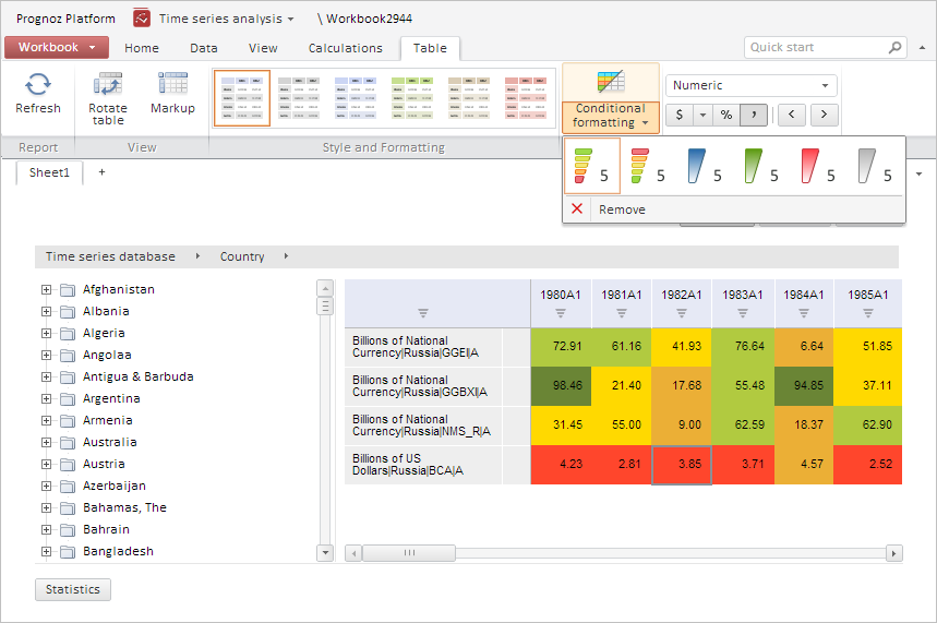 To execute the example, the HTML page must contain the WorkbookBox component named workbookBox (see Example of Creating the WorkbookBox Component),and the Table tab must be open in workbook ribbon. For the Conditional Formatting button in this tab select the first menu item that means coloring cells by scaling their values with colors from red to green: