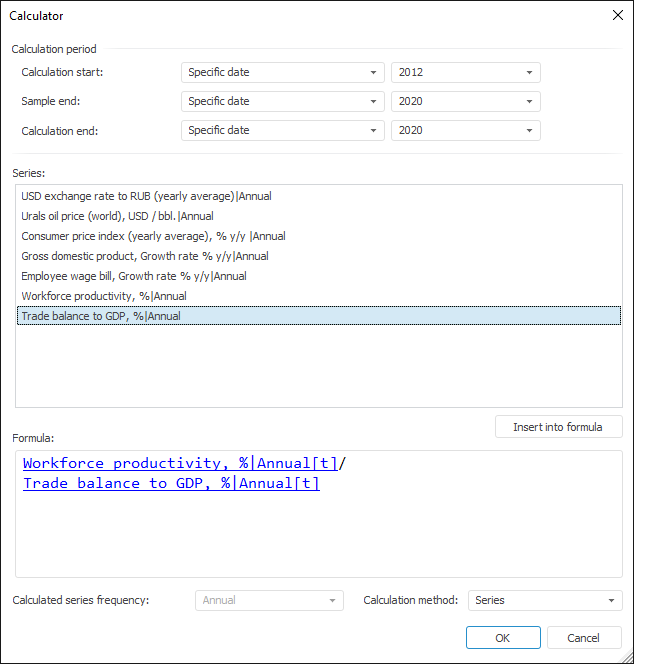 The Calculator dialog box opens that is used to create a formula for calculating a calculated series: