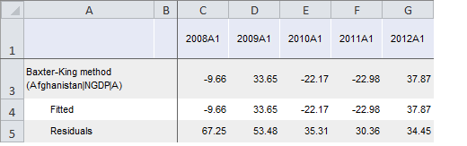 After the method is applied, a series with the name of the Baxter-King Method(<Series_Name>) type and containing calculation results is added to the data table for each of the selected series. For example: