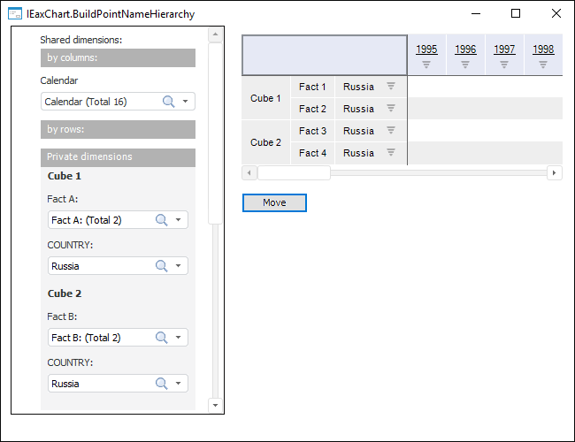 Executing the example requires a form with the Button1 button, the TabSheetBox, ErAnalyzerDimPanel component and the UiErAnalyzer component named UiErAnalyzer1 that is a data source for the mentioned visual components. For the Fore.NET Example - existing of the .NET form and similar .NET components. An express report built on several sources is connected to UiErAnalyzer1. A dimension with the Country identifier is among shared dimensions.