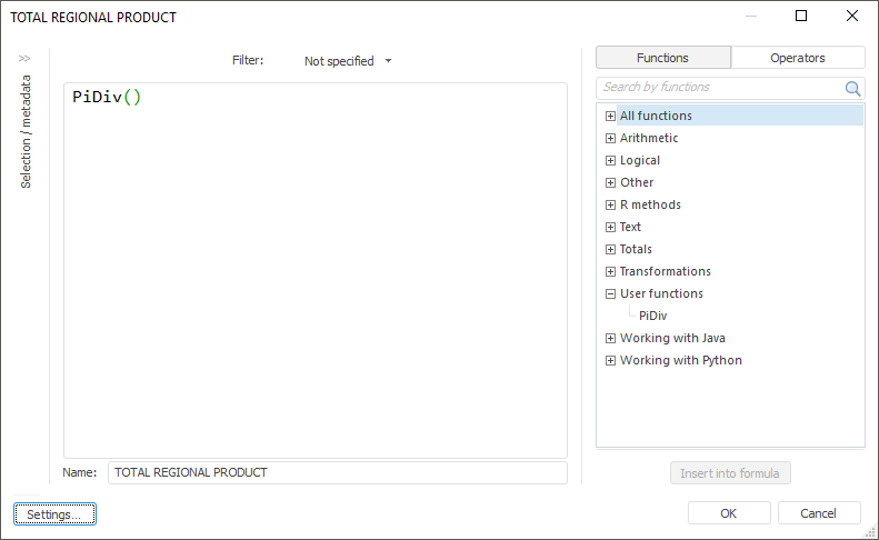 После выполнения примера в коллекцию пользовательских методов будет добавлена новая функция «PiDiv». После этого функция будет доступна для использования в различных инструментах без дополнительного подключения самого модуля: