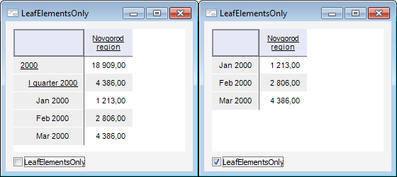 The LeafElementsOnly property determines whether it is necessary to place only leaf elements in the report (elements without selected child elements).