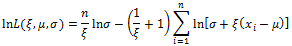 To find optimal parameters estimation, maximize ln L(ξ, μ, σ).