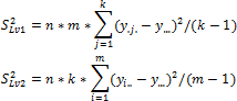 If the levels of factors x1 and x2 do not affect the y mean, all observations are the sample from the same general population (provided that the assumptions listed above are satisfied). Then the variance of the general population can be estimated in the following independent ways: using average values y for each of the factor levelsx1 or x2, or as the arithmetic mean of the estimates of variances x for each of the levels x1 or x2. As in single-factor analysis of variance, the first estimate is named the estimate of variance of the levels S2Lv, the second one is named the estimate of the error variance S2Err.