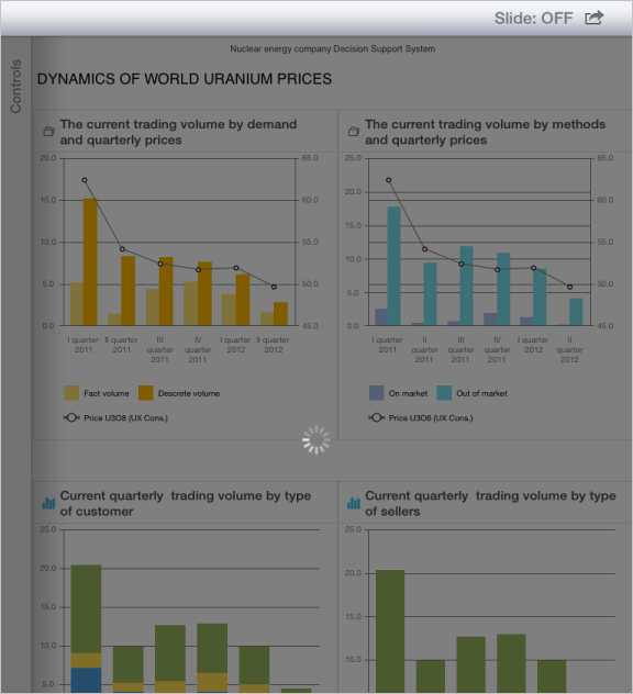 This example displays a full-screen loading indicator and a control bar. The development environment console also displays value of path to dashboard resources and the first dashboard block title.