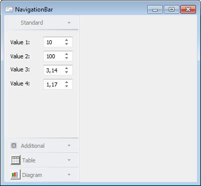 The NavigationBar1 tab collection is set up at the form startup. Four tabs are created in the collection, and the header and the panel are set up for each of them. The ImageButton components are displayed in the titles for the last two tabs. The first tab is active. Component borders are also changed.