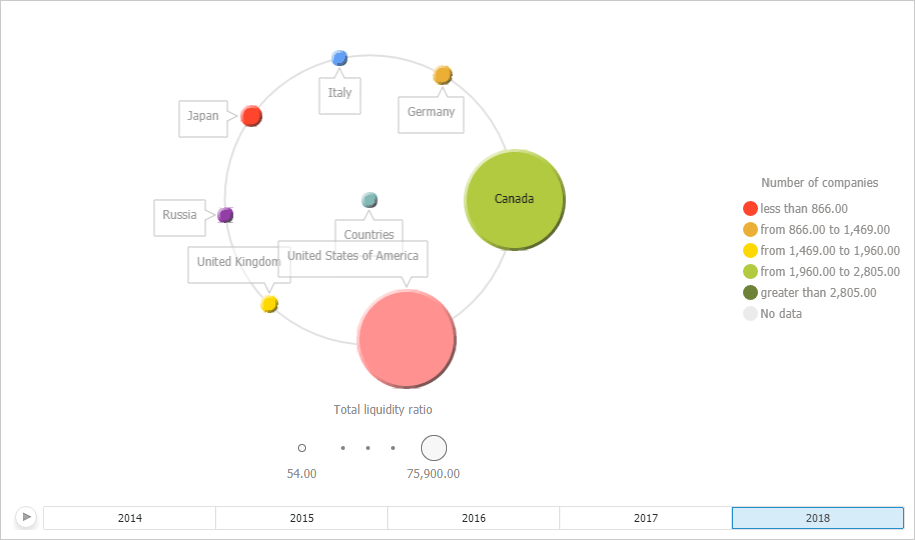 A bubble tree is a way to display hierarchical data as a set of interrelated bubbles. Each hierarchy branch is associated with a bubble that is related with the bubbles that are elements of the same level of hierarchy. All the elements of the same branch and the same hierarchical level form a circle, the center of which shows the parent element of the hierarchy. Diameter of each bubble is proportional to value of the corresponding hierarchical element. Bubble color also depends on value of the hierarchical element.