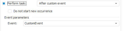 Event Parameters. In the drop-down list select the custom event which generation executes the task. In the drop-down list the available events are determined on the Custom Metadata > Events tab of the dialog of repository parameters setup.