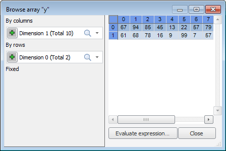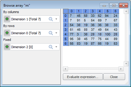 At the program runtime it is available to view values of arrays, matrices and collections inherited from the IList and IDictionary interfaces. To do this, use the special Browse Array dialog box. This dialog box can be opened for selected variable in the same way as the Evaluate Expression dialog box.