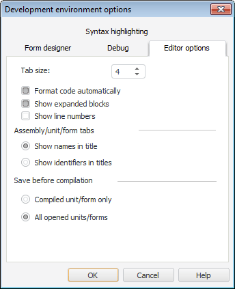 The Assembly/Unit/Form Tabs area is used to select the format for displaying tabs of opened development environment objects. By default, the titles show names of opened objects.