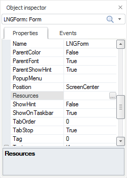 Specify the previously created ResForAppl resources in this dialog box and click the OK button. This adds the additional ResourcesID attribute to string data type properties of all visual components in the object inspector. This attribute value is generated automatically: