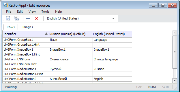 Therefore, on starting the form, components' captions and image in ImageBox1 will match value of the resources' elements for Russian.