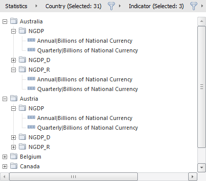 A series tree shows the tree structure of the open data source elements. The structure of the series tree is based on the chain of attributes defined in the breadcrumb. Levels of the hierarchy of the series tree are shown as folders, which names correspond to attribute values. Multiple elements can be selected in the series tree by holding down SHIFT or CTRL.