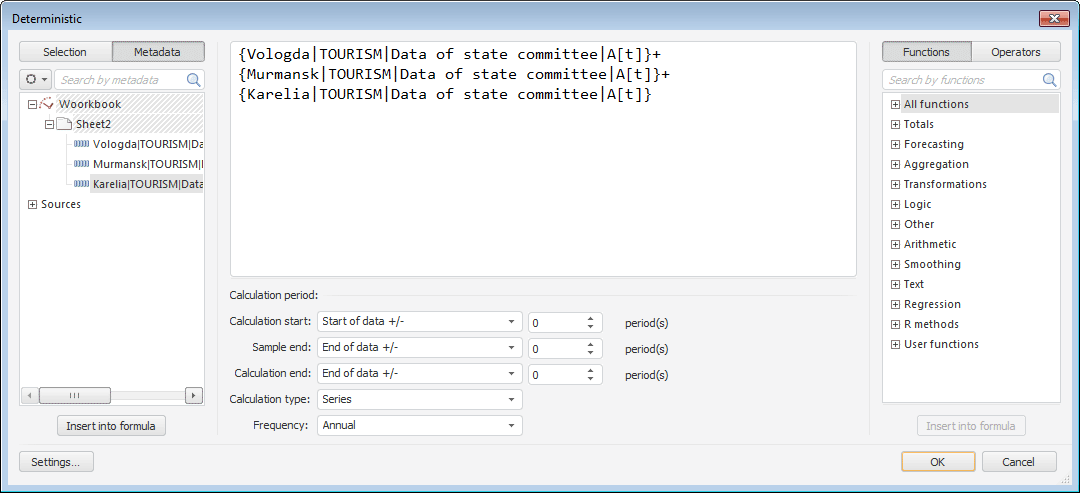 If the formula is set correctly, clicking the OK button closes the expression editor. A calculated series named Deterministic, containing calculation results, is added to the workbook. Children of this series are series included into calculation formula.