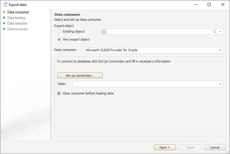 Data Consumer. Select the data consumer type. After selecting the type, its setup parameters are displayed. A set of parameters depends on the consumer type.