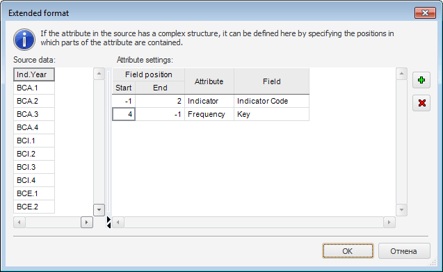 4. Use the order number of the symbol, from which the value of the time series database starts and the order number of the symbol, on which the value ends. Use the Start and End cells in the Field Position column. The numbering of symbols starts with zero. If the border is not specified, specify the -1 value