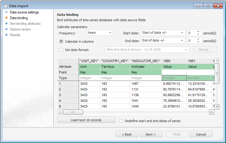 On the Data Binding page specify correspondence between data source fields and time series database attributes.
