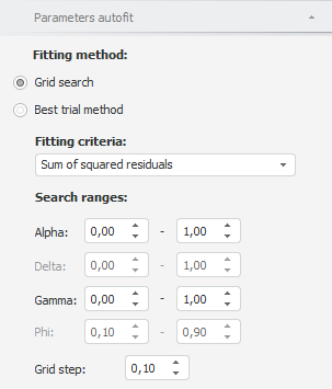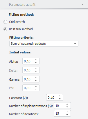 To set up autofit coefficient values parameters in the exponential smoothing model, use the Parameters Autofit tab on the side panel.
