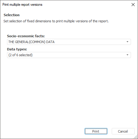 Batch print is printing of multiple report versions. Report versions are generated according to the selection of fixed dimensions.