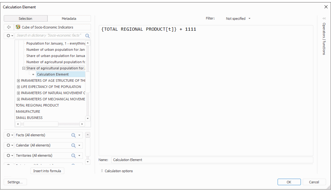 After clicking the Button2 button a dialog box of expression editor for regular report calculated element opens, which contains the element formula that can be edited: