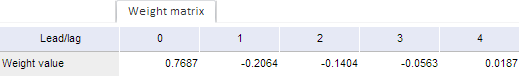 The columns contain calculated coefficient values. The matrix dimensions are 1×(q+1), where q is the Lead or Lag parameter value determined on the Equation tab of the side panel.