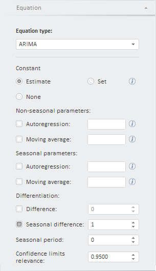 If order of autoregression or moving average is set for the ARIMA method, the side panel shows the Parameters of ARMA Estimation tab used to set up parameters of autoregression or moving average.