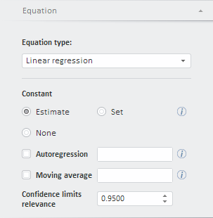 The method calculates linear regression model, the least-squares method is used to estimate coefficients. To set up method parameters, use the Equation side panel tab.