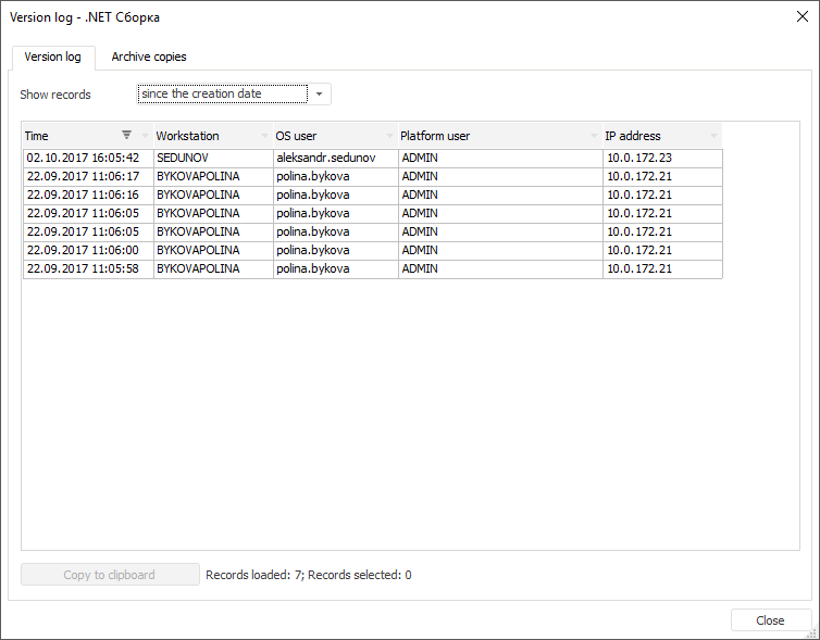 To view version history of the selected object, select the Version Log context menu. The dialog box with two tabs opens: Version Log and Archive Copies.