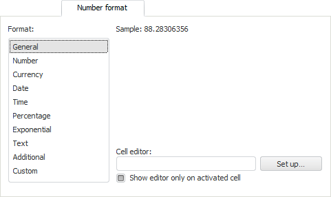The tab contains the list of predefined formats for displaying sheet cells contents. Select required data format and set its parameters. Tab appearance and settings depend on the tool in use.