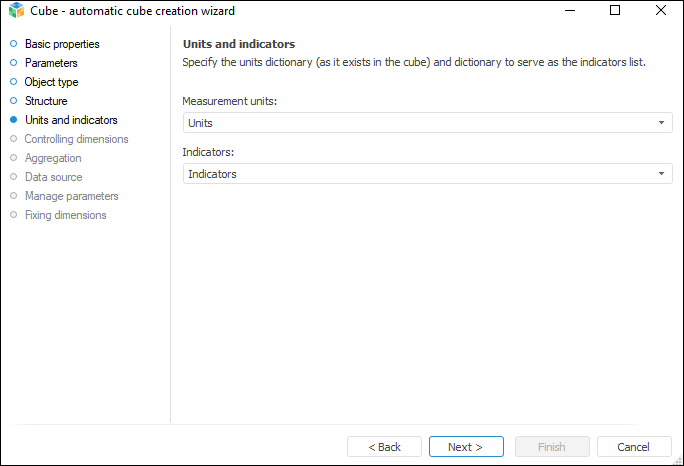 Select the dictionary in the drop-down lists that contain all existing cube dictionaries. These dictionaries must have a certain structure: Units and Indicators. If the structure of the selected indicators or units dictionary does not satisfy the required conditions, a warning message is displayed.