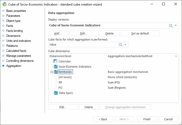In the Display Versions drop-down list select the Aggregation in the Territories variant. In the Cube Facts for which Aggregation is Performed drop-down list select the Value option. In the cube dimension list select the Territories item and click the Edit button. A dialog box for setting up aggregation for the selected dimension opens.