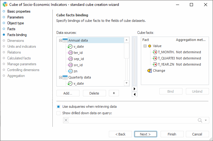 Link facts and corresponding data table fields in this dialog box. To do this, select the tables: Annual Data, Quarterly Data and Monthly Data in the left part of the dialog box. Then drag the Value field of each table to the Value factor.