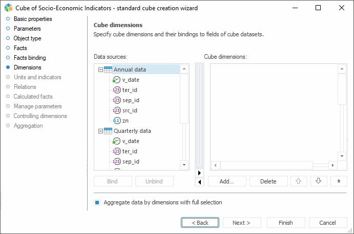 This wizard page is used to determine a list of dictionaries that included into a cube, and to bind them to data tables.