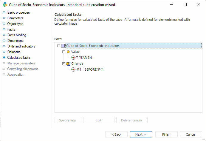 Specify a formula for the Change fact. Select the fact, and click the Edit button. The Calculable Fact dialog box opens: