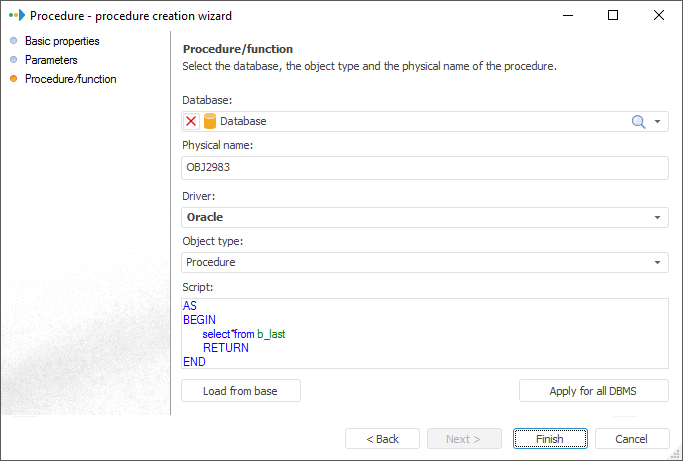Unlike the DBMS command, a stored procedure or function is created on the server when the Procedure object is created in the repository. Several repository procedures may refer to the same stored procedure on database server. Changes in text of a stored procedure affect all objects referring to this procedure. The result of a procedure is the number of processed records, or some specific value if a function is created instead of a procedure.