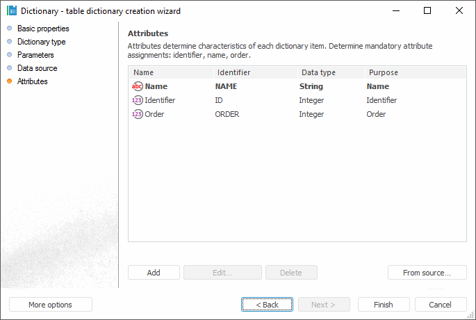To form a list of attributes based on the list of source fields, click the From Source button. The button is available if the source structure, on which the dictionary is based, has been changed, and the dictionary structure is required to update.