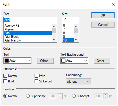 To change font style, size, color and other parameters of text sheet font, use the Font dialog box: