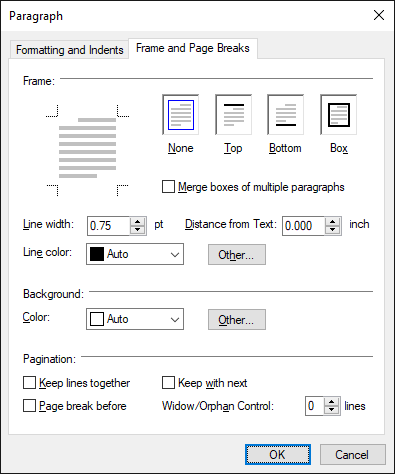 To add frames around text and set up page numbering, use the Frame and Page Breaks tab: