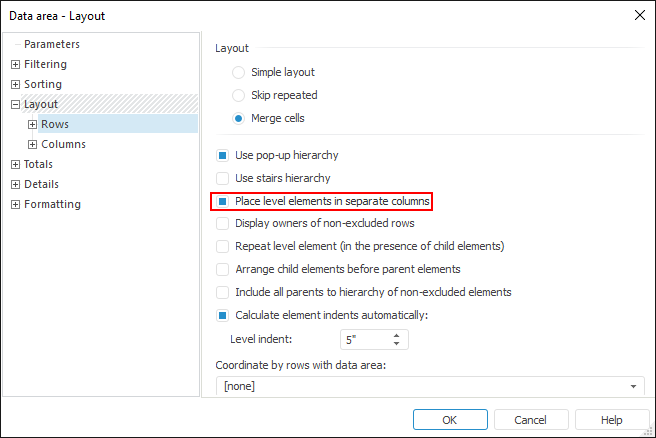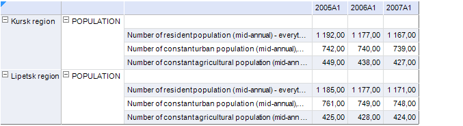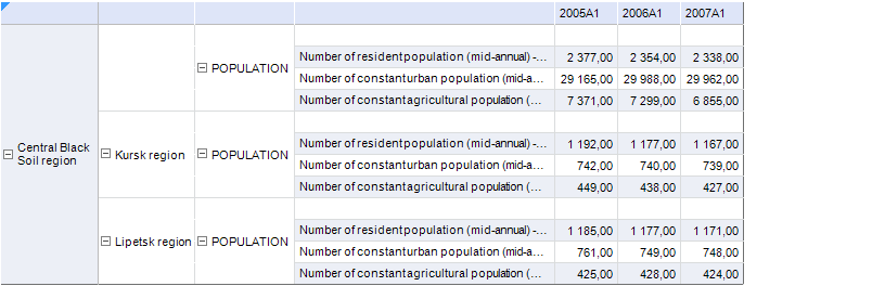 A data area sidehead can use several dimensions, each dimension can have a separate hierarchy. If the dimension has a large hierarchy, it may require to display only leaf dimension elements for a more convenient sidehead display, that is, lower hierarchy level elements.