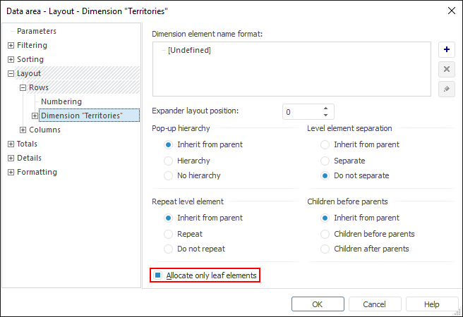 Select the Territories dimension and select the Allocate only Leaf Elements checkbox for this dimension: