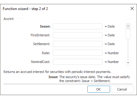 The function wizard for the Accrint function looks as follows: