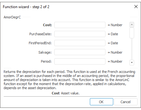 The function wizard for the AmorDegrC function looks as follows: